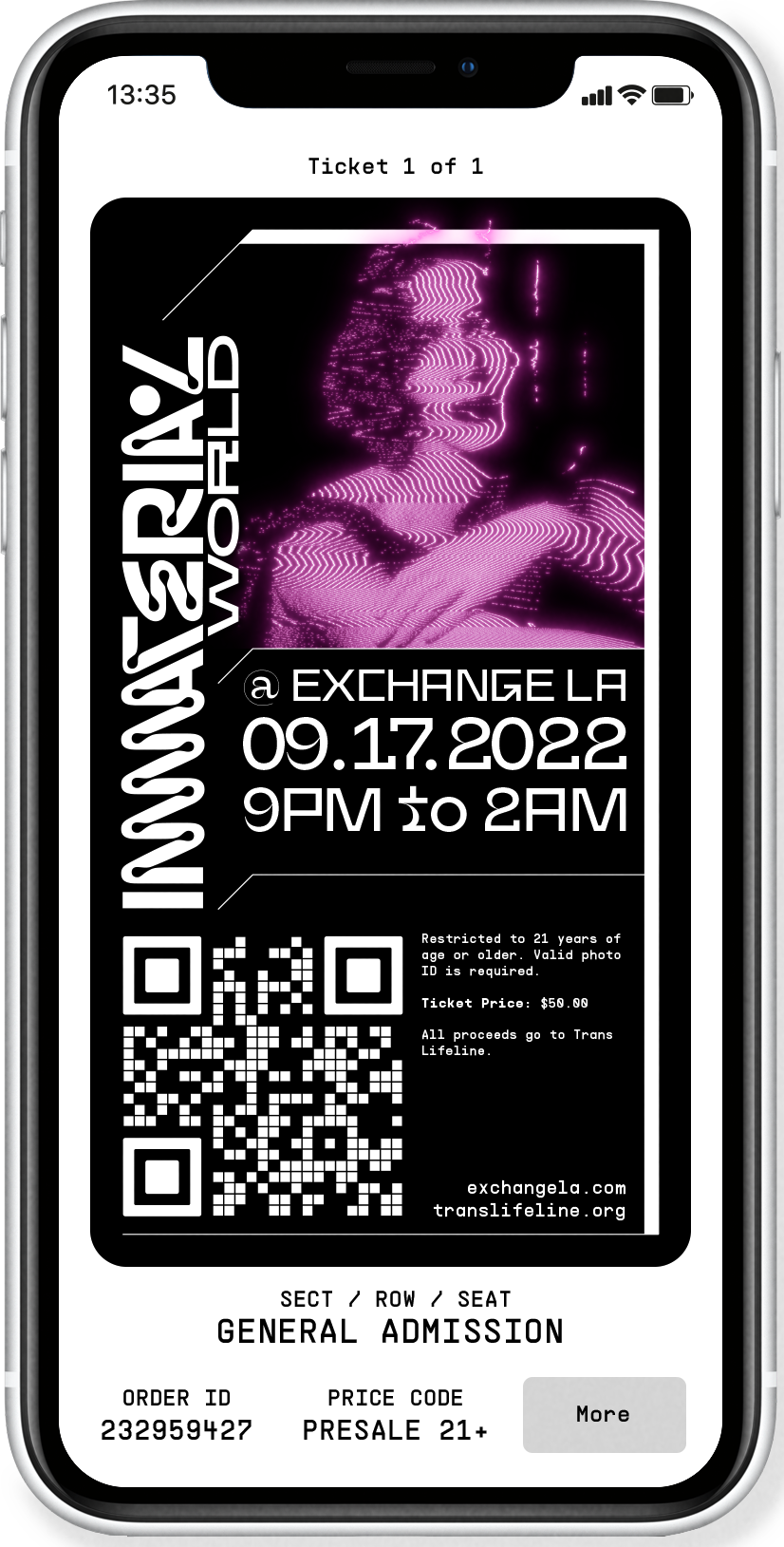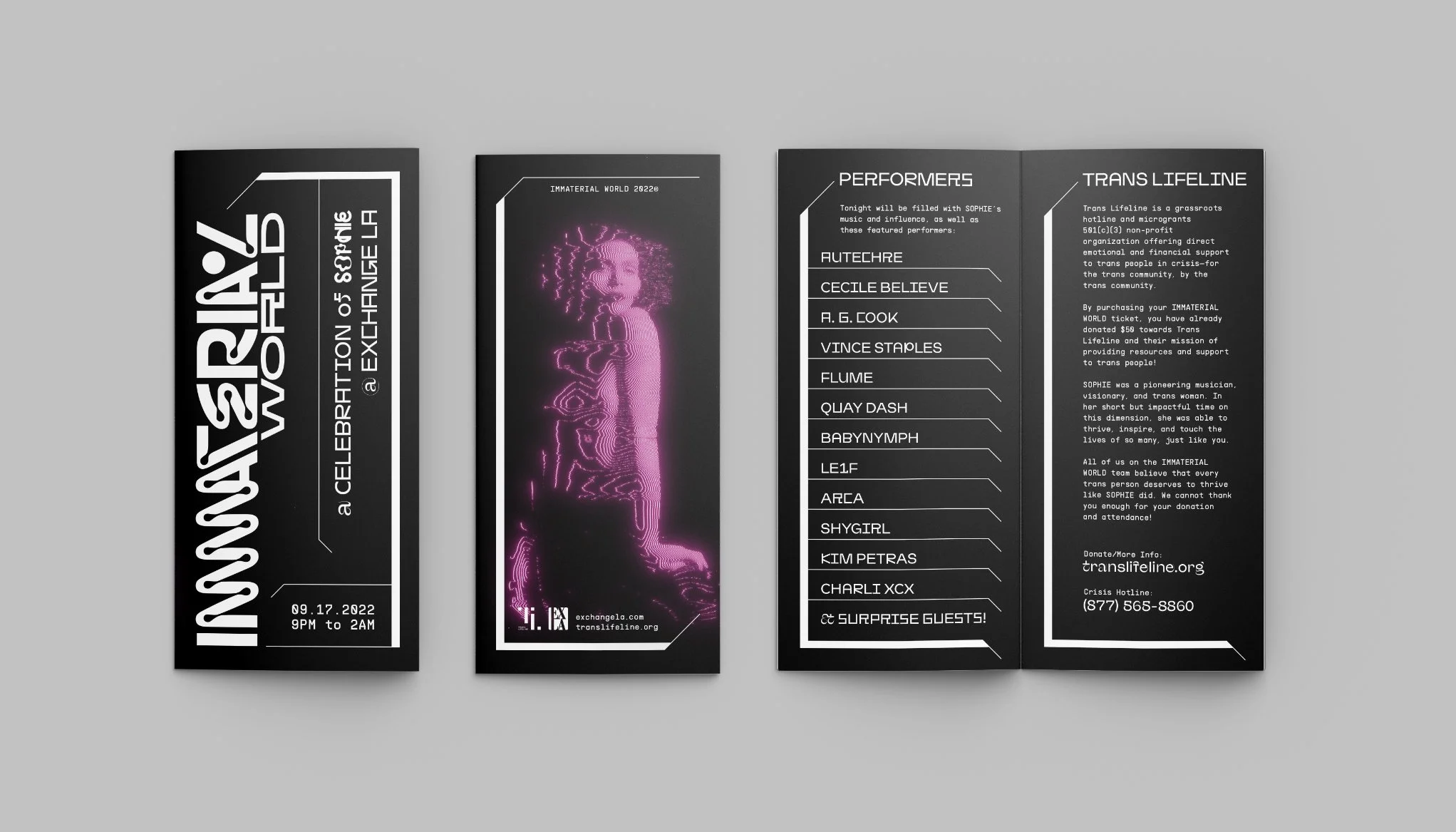 IMMATERIAL WORLD is a fictional tribute event to the trailblazing late electronic musician, producer, and DJ SOPHIE, who passed away tragically and unexpectedly on January 30th, 2021. This was during the pandemic, so there was no way to celebrate her life and music in person. This event was meant to serve to remedy this at a later date and features a lineup of many of SOPHIE's collaborators.